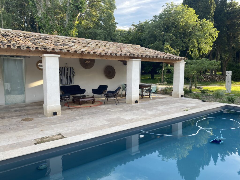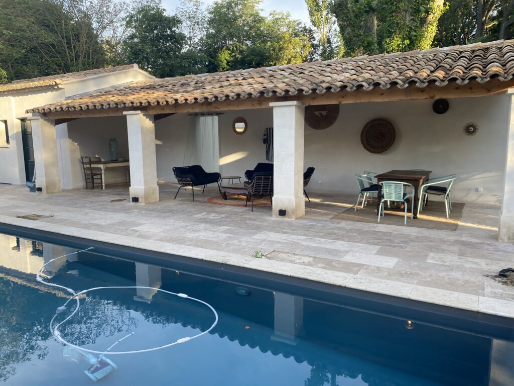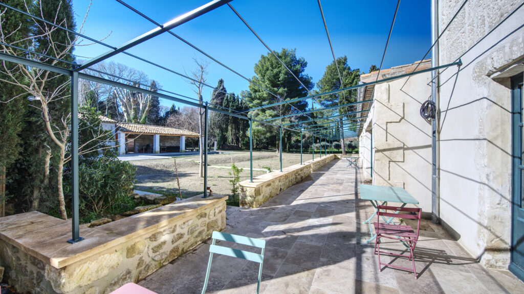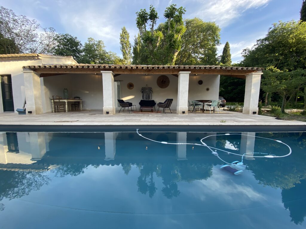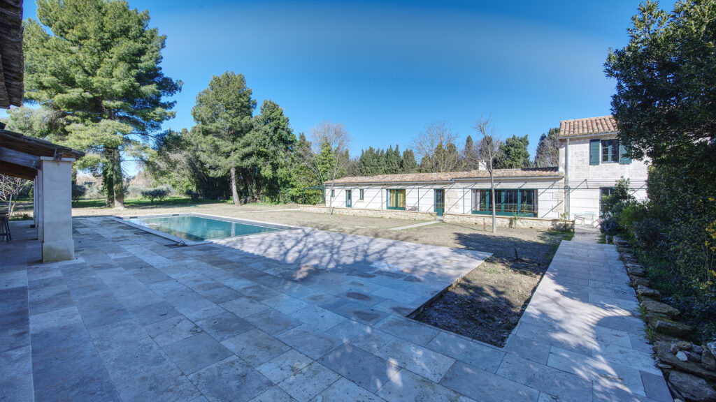 La piscine, élégamment intégrée dans son environnement, devient le point central des journées estivales. Bordée de verdure et baignée de soleil, elle offre un espace idéal pour se rafraîchir, se reposer ou simplement profiter du calme absolu des Alpilles. Autour, les terrasses permettent d’alterner entre bains de soleil, lectures à l’ombre et moments partagés en famille ou entre amis.