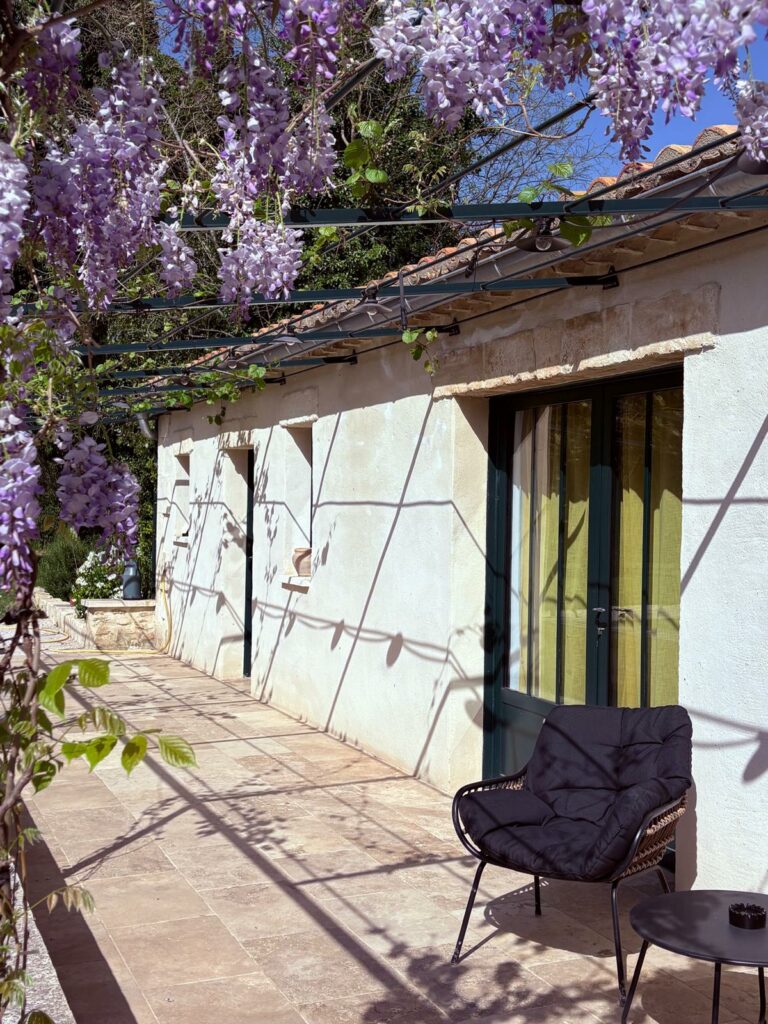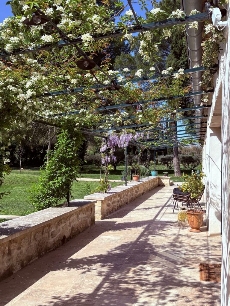 Under a pergola covered in flowers, you find shade without losing light. A simple table becomes the centre of the experience.
